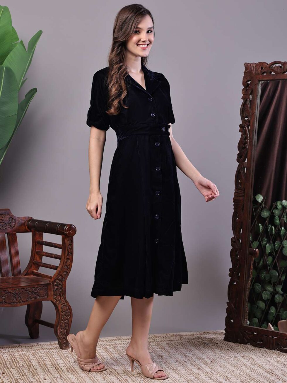 Women’s Black Velvet Solid Printed Shirt Midi Dress with Belt